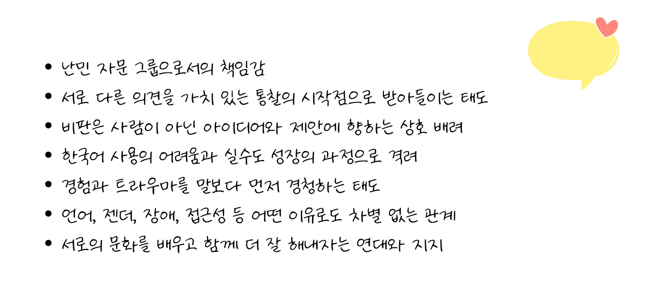 멤버들은 강제실향 과정, 문화적 배경, 한국 사회에서 난민으로 살아가며 느낀 점 등을 공유하며 서로의 관점을 새로운 통찰로 확장했습니다. 또한, ‘의미 있는 참여’를 위해 난민 자문 그룹 내에서 어떤 태도와 관계가 필요한지 고민하고 의견을 나눴습니다.
